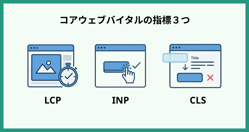 具体的には、ページの主要コンテンツが表示される速さを示す LCP(Largest Contentful Paint)、ユーザー操作に対する応答性を測るINP(Interaction to Next Paint/旧FID)、ページ閲覧中のレイアウトの安定性を表すCLS(Cumulative Layout Shift)の3つが対象です。これらが一定の基準を満たすことで、ユーザーにとって快適な閲覧体験が保証され、検索結果における上位表示の可能性も高まります。