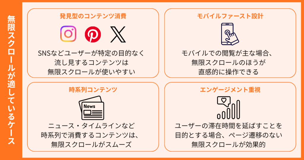こちらをご覧いただくとわかるように、基本的に無限スクロールが必要なケースは限られると言えます。