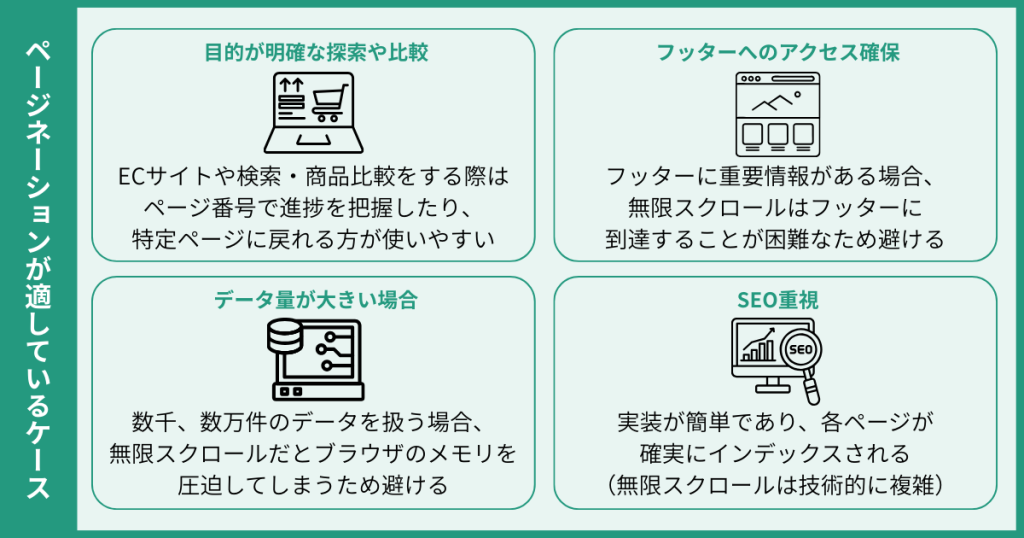 ページネーション・無限スクロールがそれぞれどのようなケースで適しているか、下記の図にまとめます。