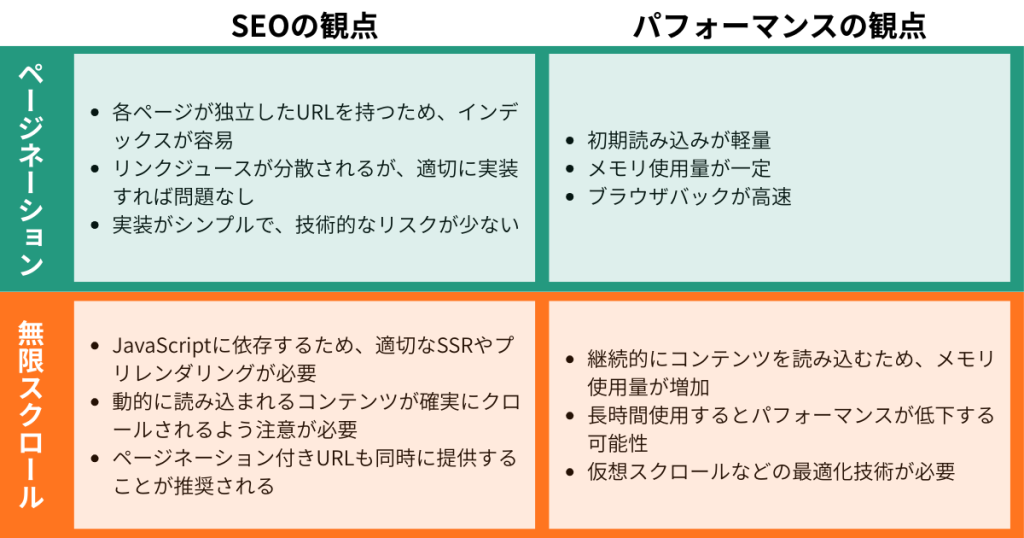 最後に、ページネーションと無限スクロールをSEOとパフォーマンスの観点から比較してみます。