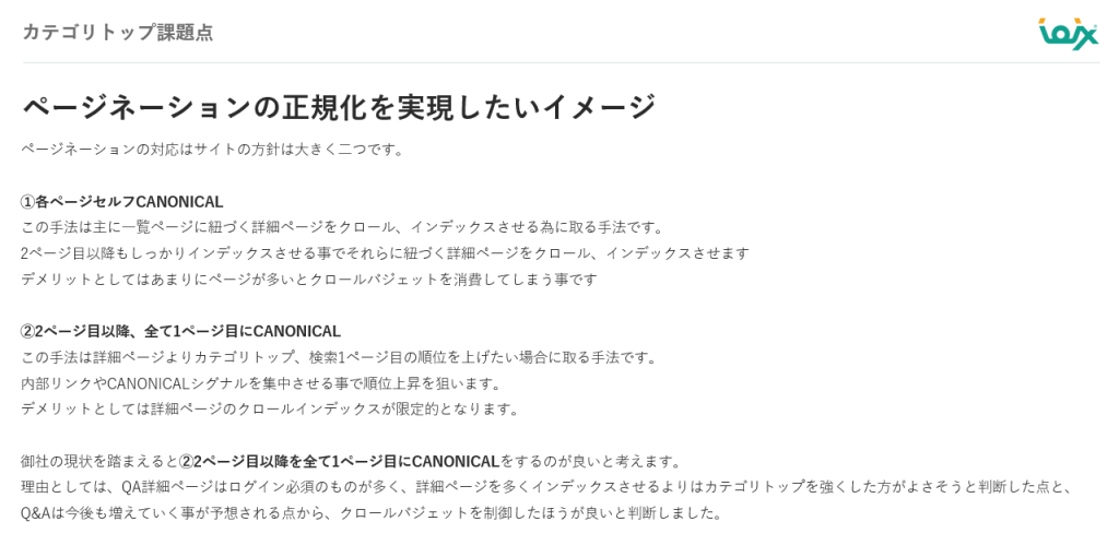 Q&Aは今後も増えていく事が予想されるため、クロールバジェットを制御したほうが良いという考えから、2ページ目以降を全て1ページ目にCANONICALが良いと提案しています。
