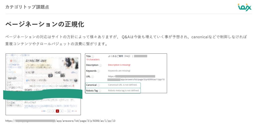 基本的には各ページネーションページに自己参照のcanonicalタグを設定となりますが、場合によってはcanonicalで1ページ目に評価を集めた方が良い案件が存在することも事実です。詳しくは「3.アイオイクスでのページネーションに関する施策事例」部分をご確認ください。