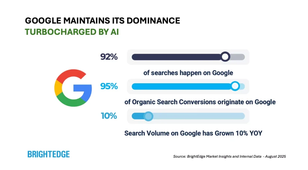 当社の内部データによると、全検索の92%がGoogleで行われています。ダウンロード、登録、購入といった意味のある行動に至っては、95%がGoogleから始まっています。また、検索ボリュームは減少するどころか、実際、前年比10%増加しています。