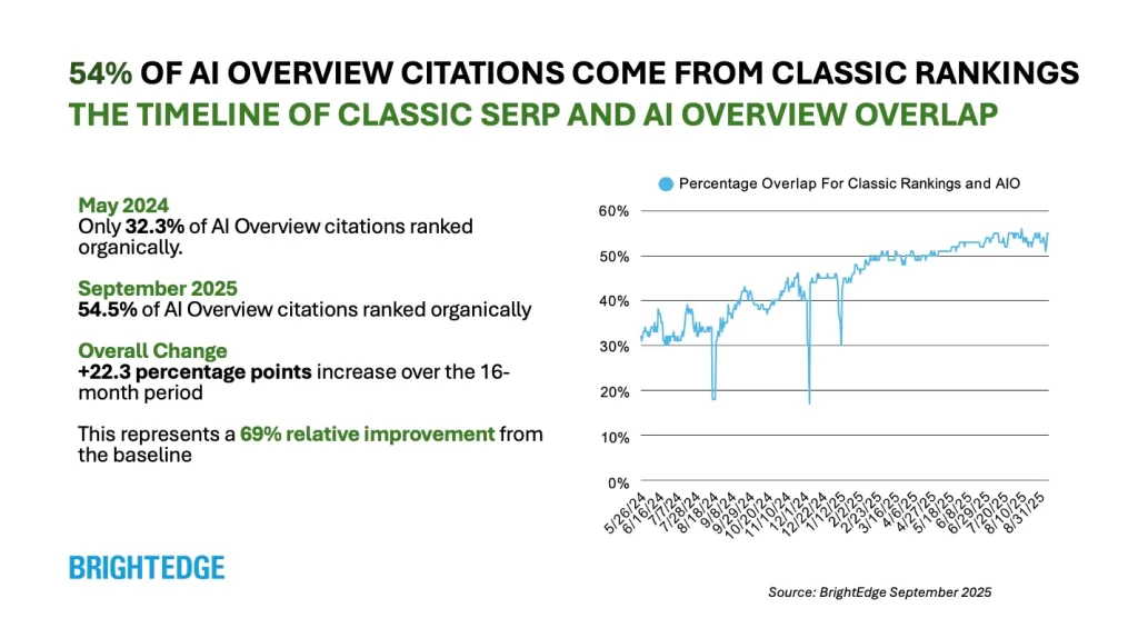 AIが生成する要約や回答と、従来の検索結果の両方に同じサイトが表示される割合は、2024年以降に22.3%増加しています。