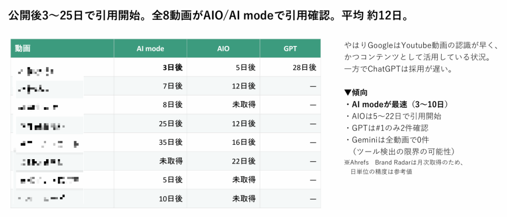 アイオイクスが2025年後半~2026年前半まで行ったYouTubeの施策では、以下のような結果が見られました。計測はAhrefsのブランドレーダーによるものですが、AI modeやAI Overviewsでは、Youtubeが公開から3週間以内に引用される傾向が確認できています。